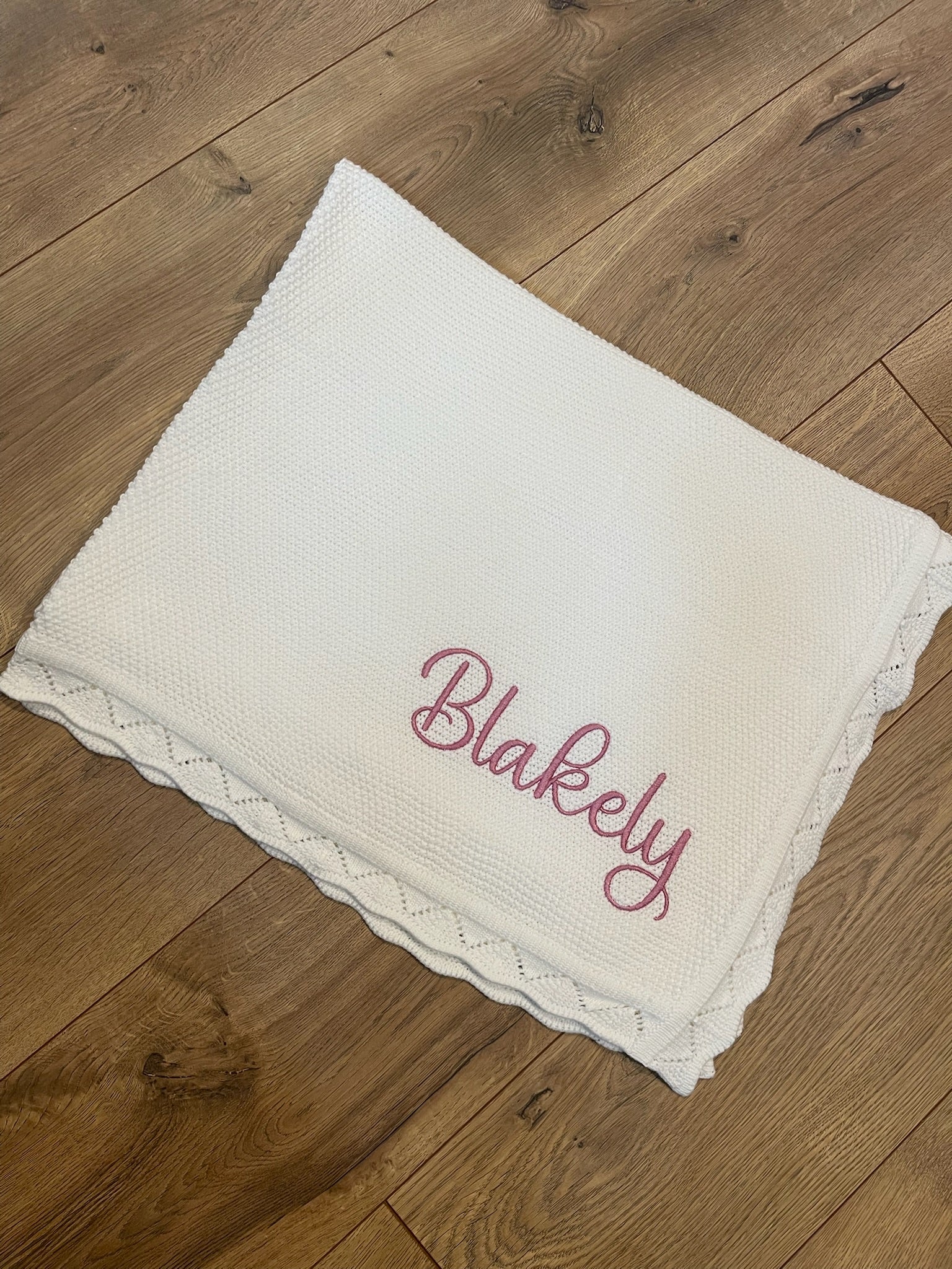 Please indicate the name you'd like stitched, the font choice, and the thread color(s) you'd like.